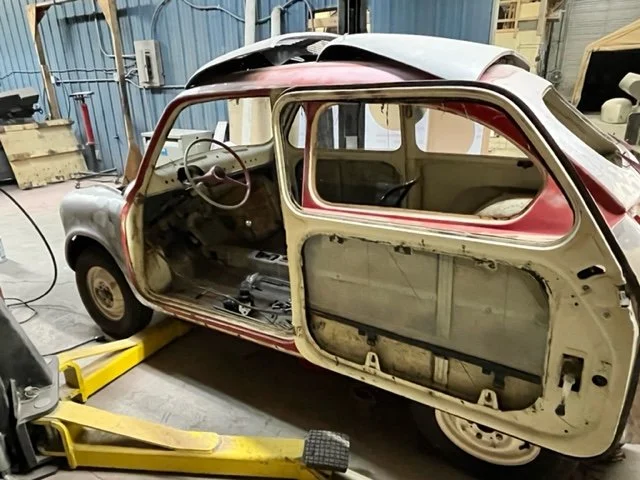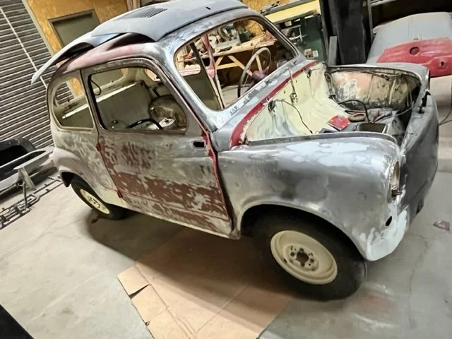 We don’t have a lot of space here, but this Fiat fits in our shop doors. Total restoration project.